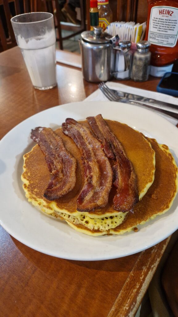 Śniadanie w naszym hotelu okazuje się dość słabe; oprócz omletów, jajek i bekonu nie ma specjalnie atrakcyjnych potraw. Zero warzyw, niejadalne gofry i babeczki.