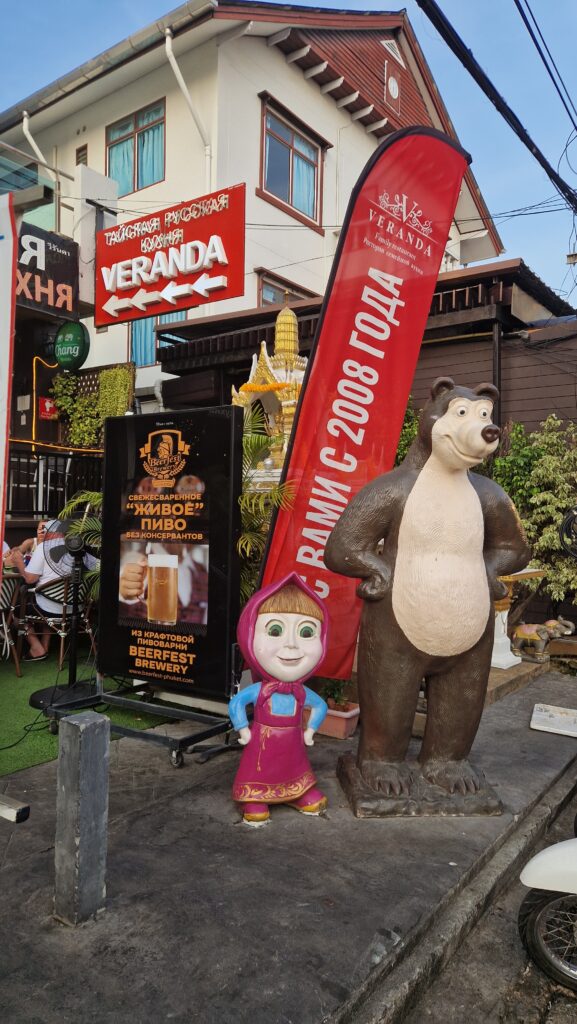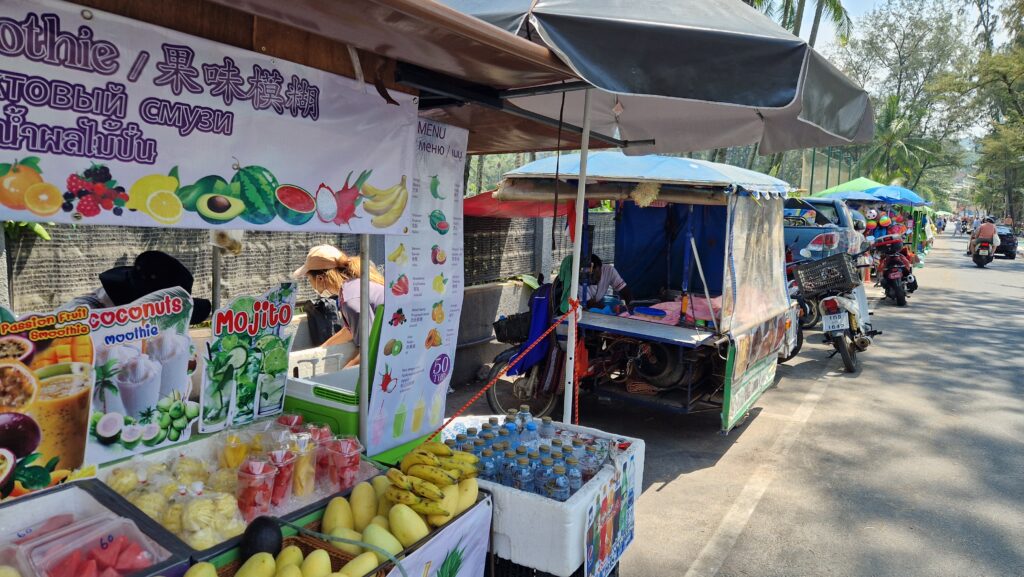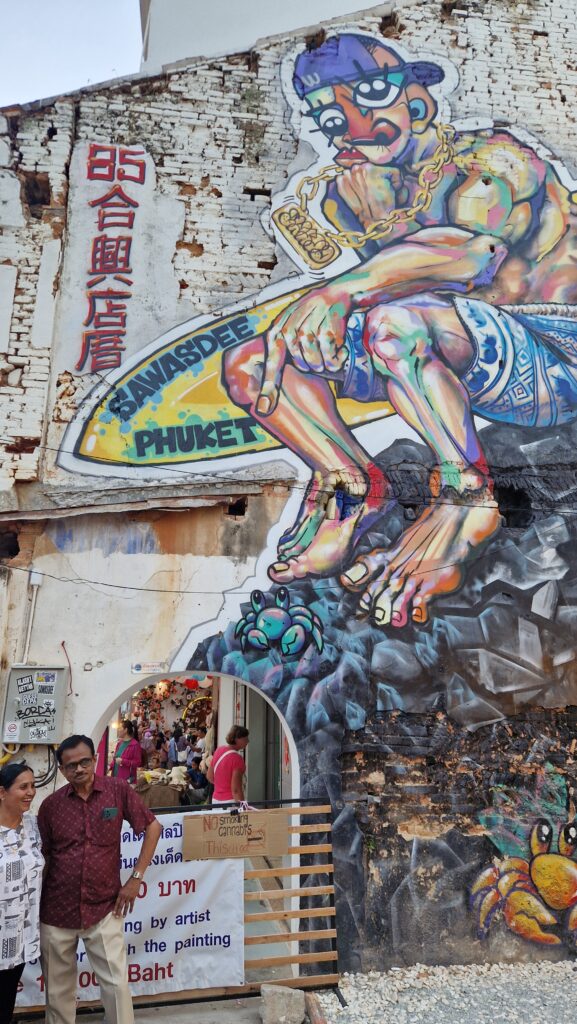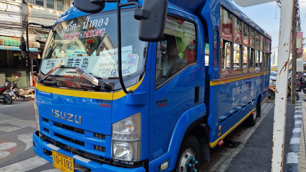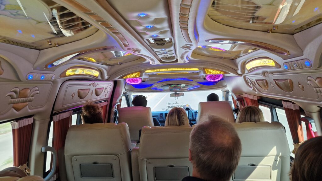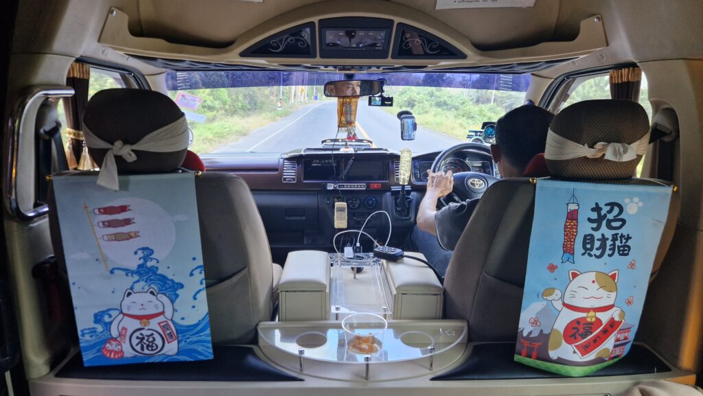 Na wycieczkę jesteśmy dowiezieni Toyotą-vanem zdobnym w imprezowe wzory. Jest to model samochodu, który spotykamy praktycznie wszędzie. Takie były nasze vany, którymi jechaliśmy pomiędzy prowincjami Phuket, takich vanów są całe sznury na drogach. Są bardzo wygodne; mają 10 miejsc, w praktyce wiozą zwykle mniej osób.