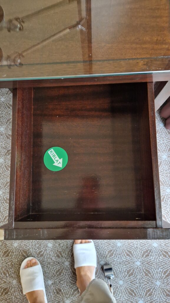 W hotelach na Półwyspie Malajskim oznaczony jest kierunek, w którym muzułmanie powinni się modlić. W niektórych hotelach strzałka jest na suficie, w tym – strzałka jest w szufladzie.