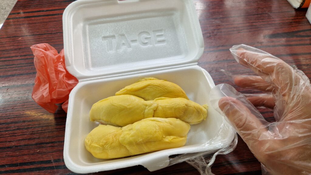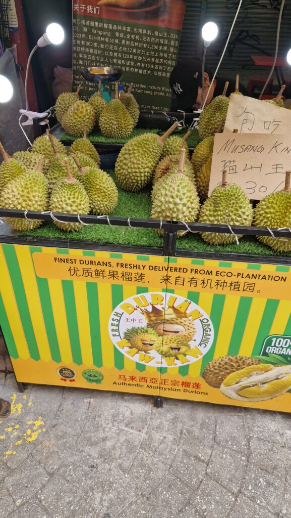 Podczas pobytu w Malezji jakoś nie złożyło się, żeby zjeść duriana, tutaj w końcu się złożyło. Cena za porcję spora, bo SGD 30-50 (w zależności od gatunku). No ale warto; mogę się zgodzić z tezą, że to jeden ze smaczniejszych owoców – i jednocześnie jeden z gorzej pachnących.
